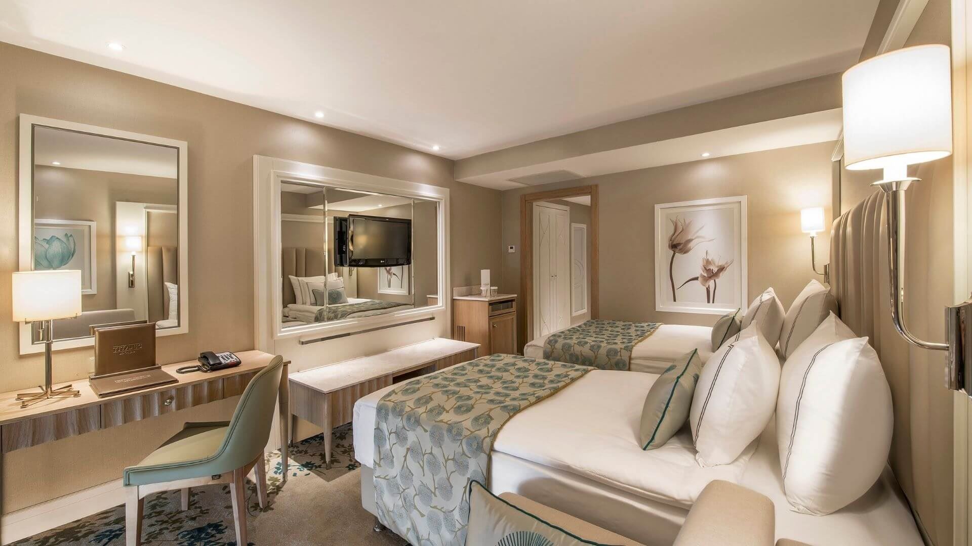 Titanic Beach Lara, with its 586 rooms spread over an area of 95 thousand square meters that attracts attention with its advantageous location close to the city, has its guests experience a magnificent holiday with its thematic architecture, chic decoration, pleasant rooms and warm atmosphere. Titanic Beach Lara that is in Lara, the pearl of the Mediterranean coasts and home of the rare sea daffodil, offers its guests options of comfort, flavor and entertainment all together and gives them various opportunities to draw away from the rush of daily life in order to have a wonderful time.