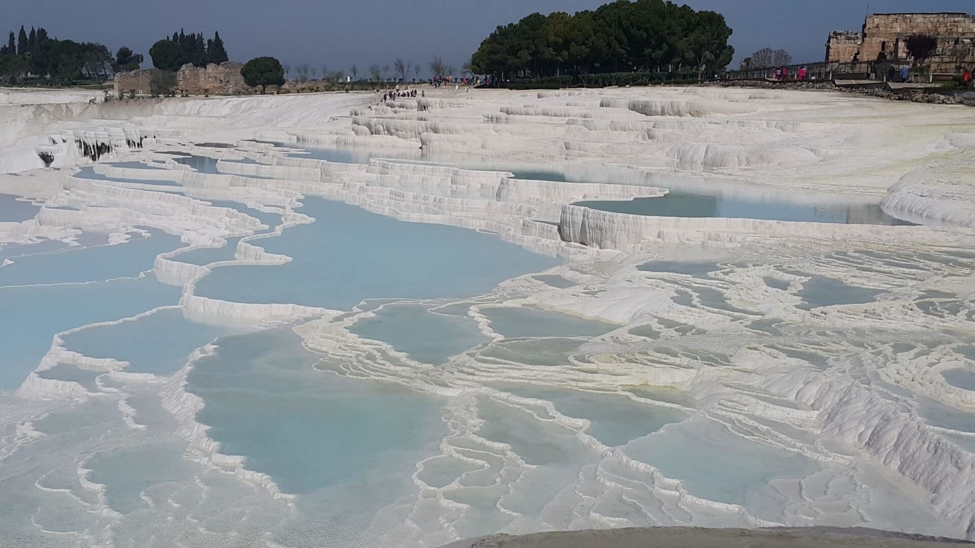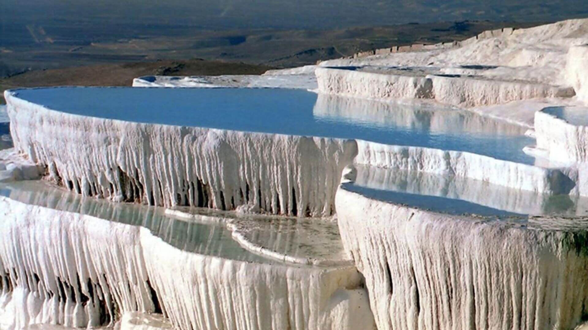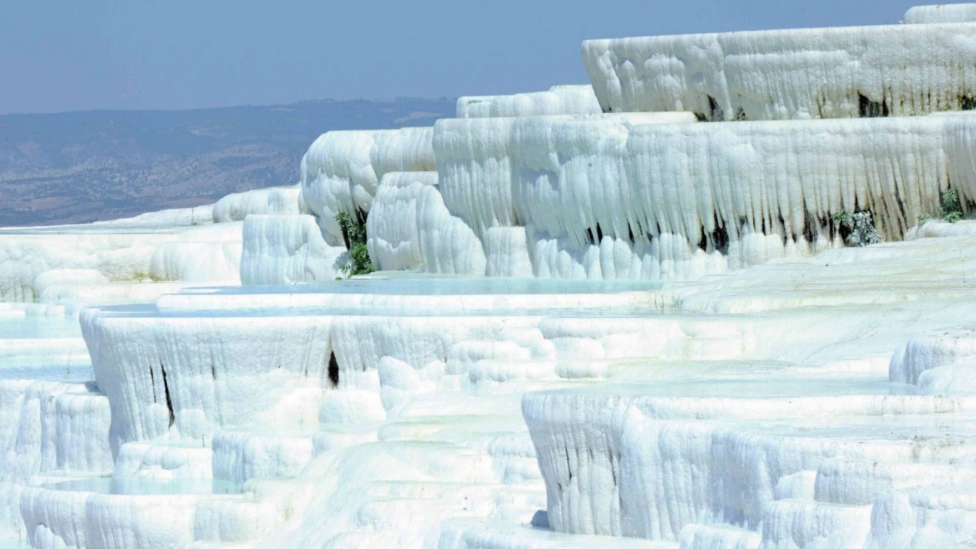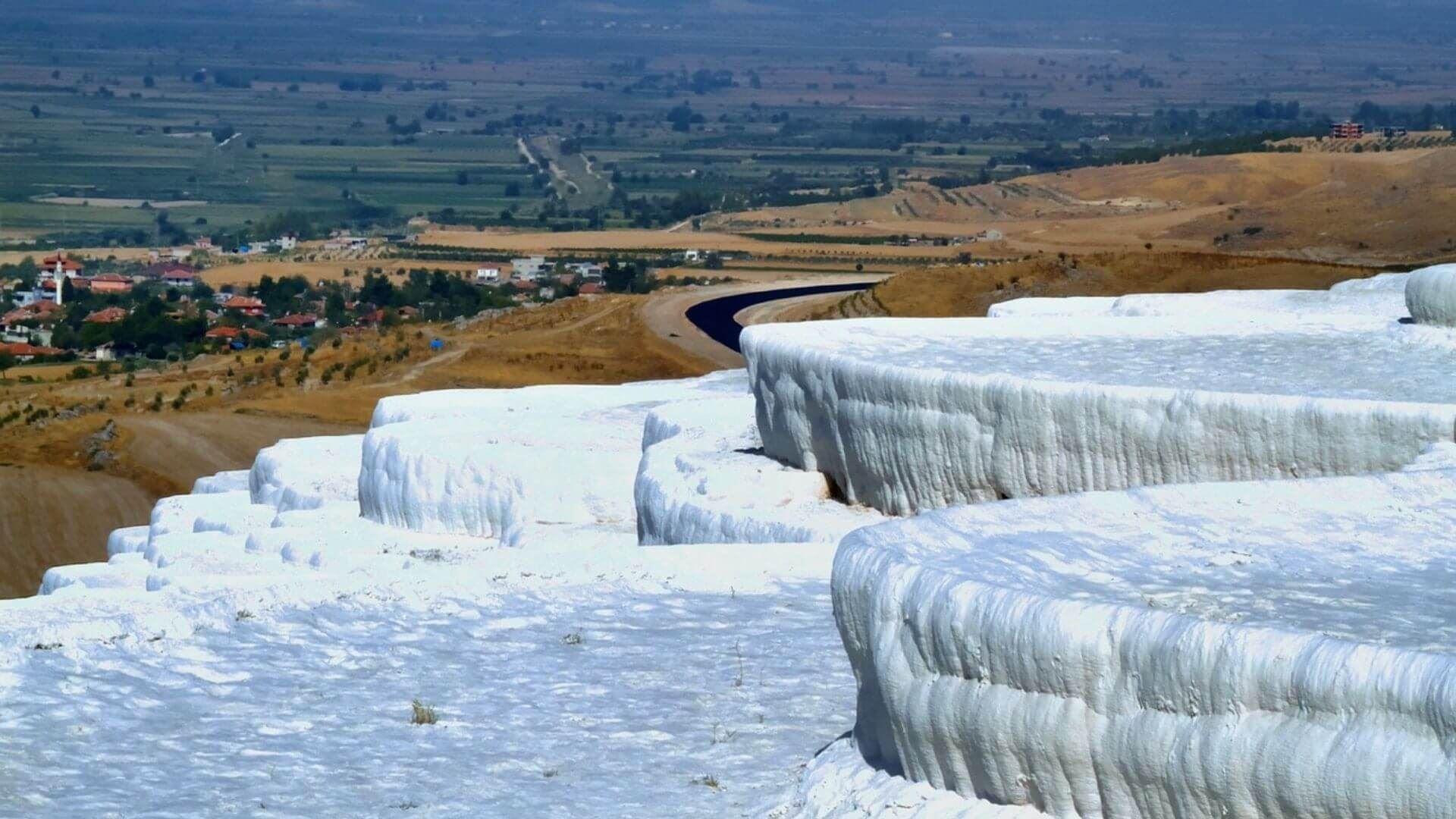 Pamukkale, meaning "cotton castle" in Turkish, is a natural site in Denizli in southwestern Turkey. The area is famous for a carbonate mineral left by the flowing water. It is located in Turkey's Inner Aegean region, in the River Menderes valley, which has a temperate climate for most of the year. The ancient Greco-Roman city of Hierapolis was built on top of the white "castle" which is in total about 2,700 metres (8,860 ft) long, 600 m (1,970 ft) wide and 160 m (525 ft) high.