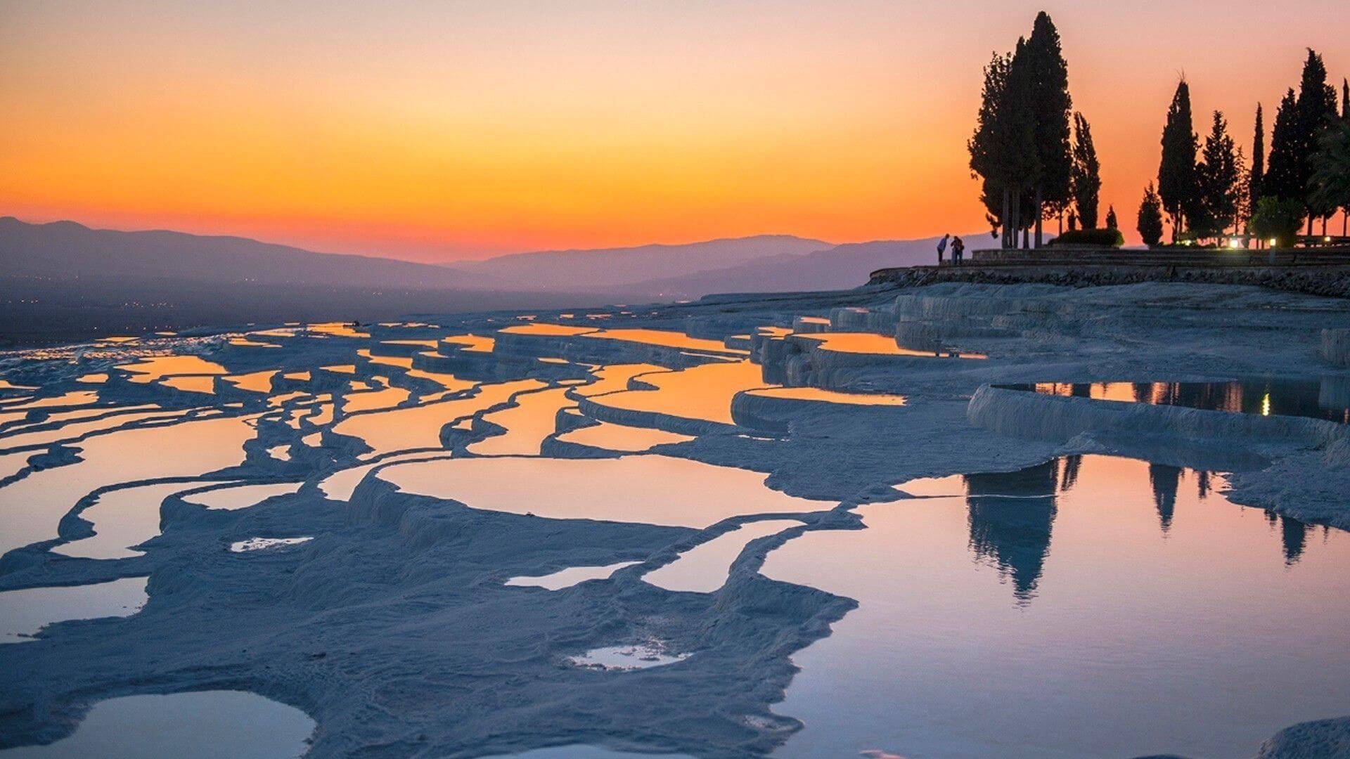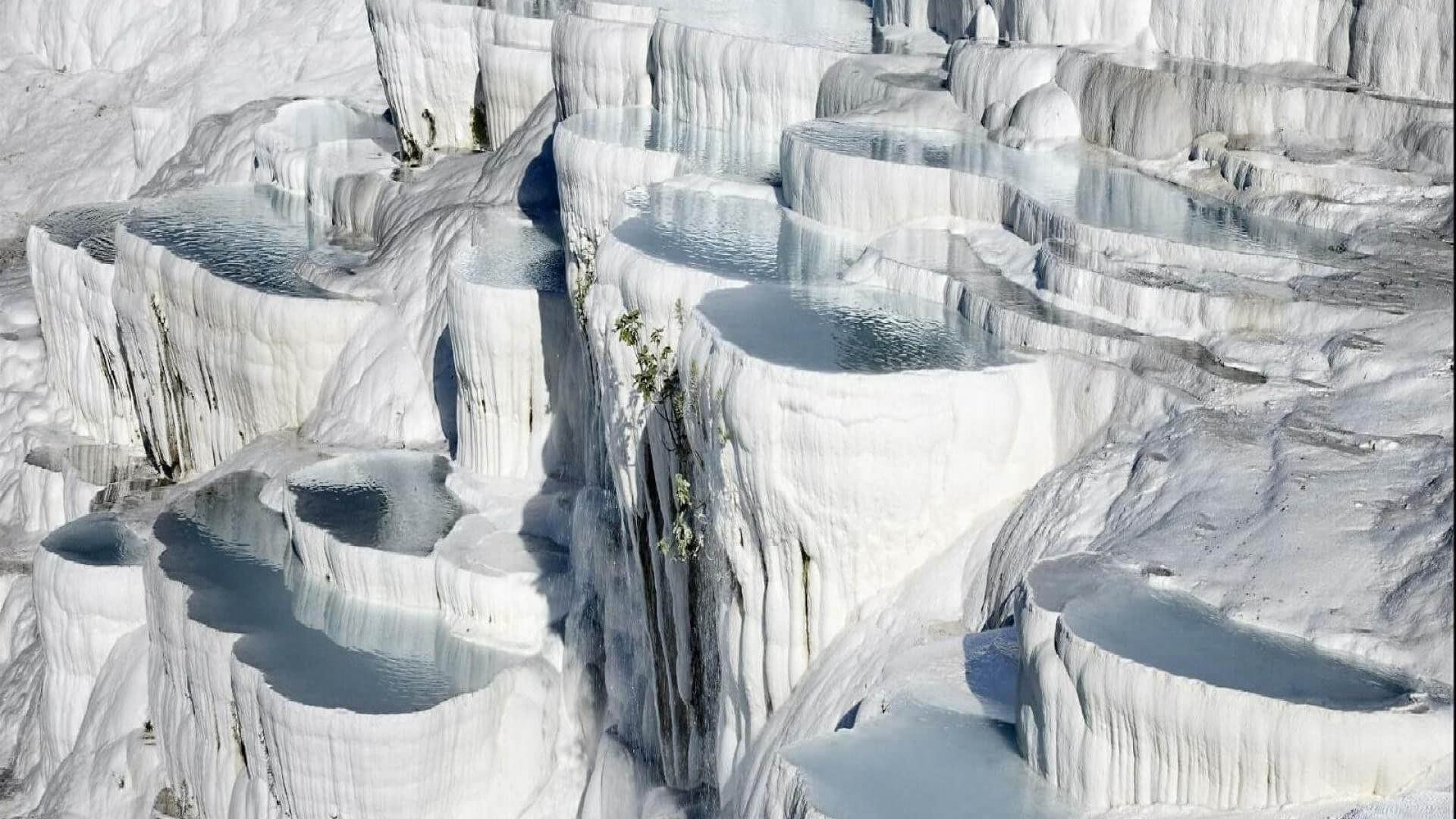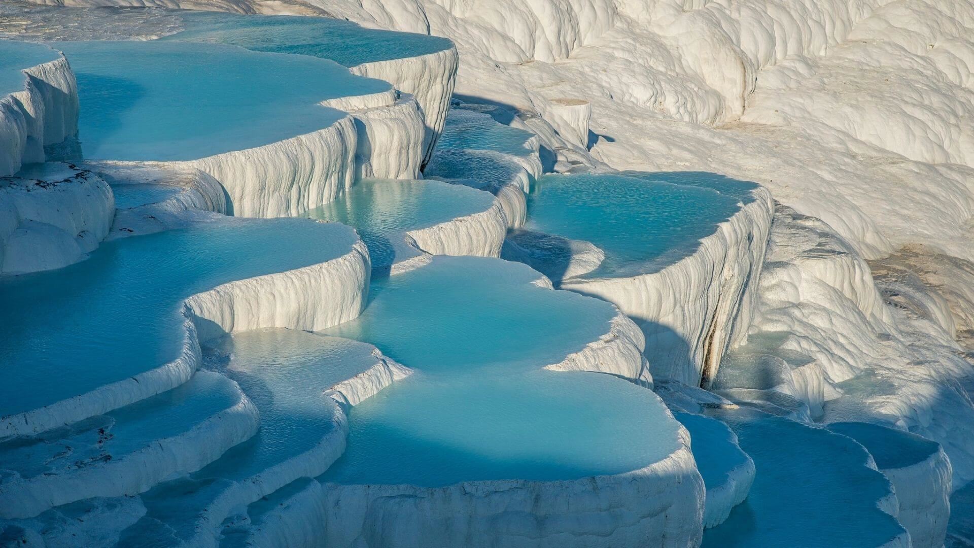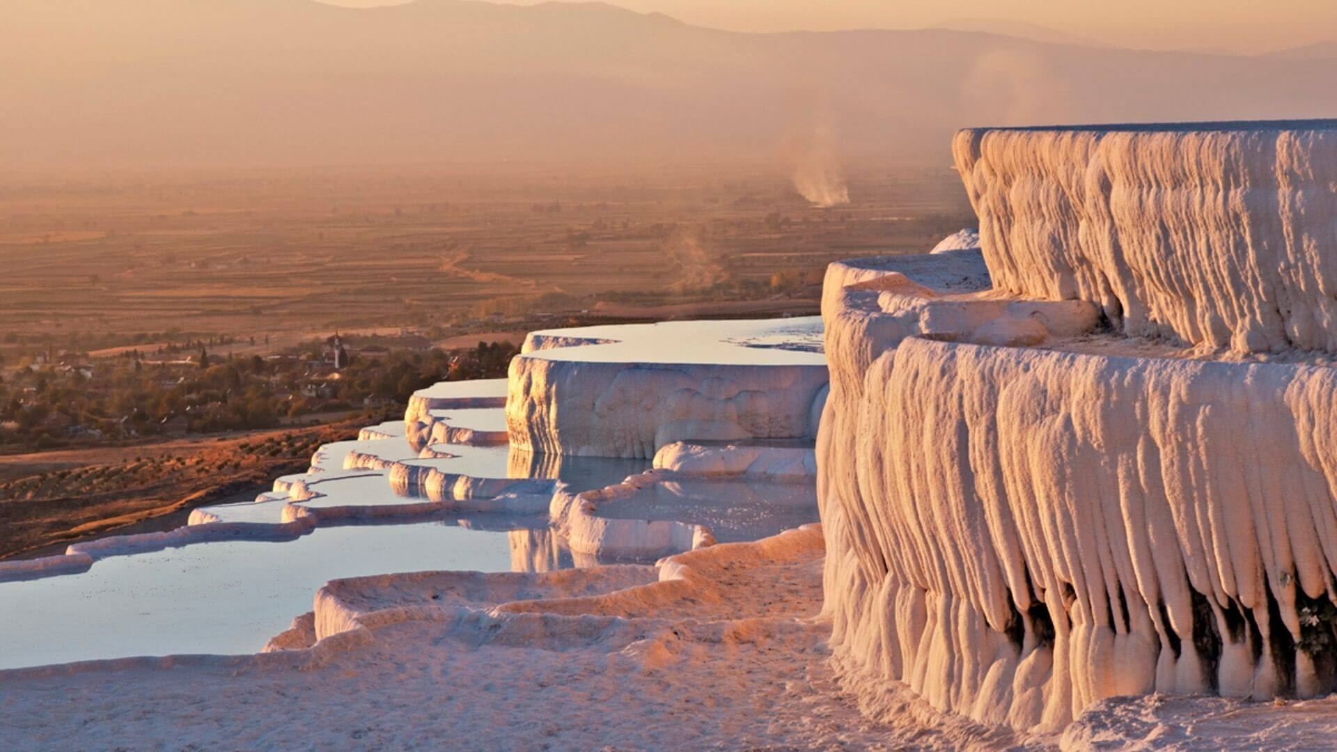 Pamukkale, meaning "cotton castle" in Turkish, is a natural site in Denizli in southwestern Turkey. The area is famous for a carbonate mineral left by the flowing water. It is located in Turkey's Inner Aegean region, in the River Menderes valley, which has a temperate climate for most of the year. The ancient Greco-Roman city of Hierapolis was built on top of the white "castle" which is in total about 2,700 metres (8,860 ft) long, 600 m (1,970 ft) wide and 160 m (525 ft) high.